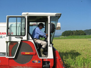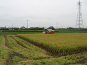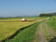 乗松さんの山田錦の圃場は旧豊岡村(現磐田市)。浜松方面から行くと、天竜川に架かる浜北大橋を渡り、しばらく下流(南)方向に行った、天竜川東岸から100メートルくらいのところにあります。到着すると、刈り取りの真っ最中でした。おそらく、コンバインに乗るのは息子の浩二さんだろうと思っていたのですが、実際運転していたのは乗松さんご本人でした。