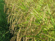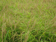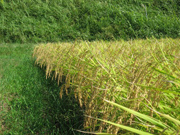 さて、それでは、刈り取りの適期はいつなのか、そして、それをどのように判断するのでしょうか。 稲を想像してください。稲一株には数本の茎があり、一番上の方に穂があります。穂をよく見ると、茎から出ている何本かの細い枝[これを枝梗(しこう)と言います]の先に実(もみ)を付けています。その、もみが黄色くなっていれば完熟している証拠です。枝は何本かありますが、一番先の枝がだんだん黄色になり(農家の人は「枯れる」と言います)、全体が黄色になったとき、そのときが刈り取りの適期に入った印です。