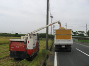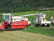 トラックに積まれた刈り取られたばかりのもみを手のひらに乗せながら、剛志さんは「質はいつもと同じくらい。おそらく量も例年並みだと思います」と、今年の出来について語りました。ちなみに、太田さんは去年(平成20年度)、研究会の表彰において、優秀な山田錦をつくったことで、JA農産物検査員選考表彰者に選ばれています。今年も上質な山田錦が期待できそうです。