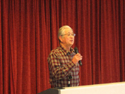 続いて、研究会の乗松相談役が「データ分析に基づく山田錦栽培の取り組み方」と題して講演を行いました。冒頭では、いま話題となっているTPP(環太平洋連携協定)について解説するとともに乗松相談役の考えを述べ、これからの日本の米づくりは世界の動きが大きく反映されると語りました。