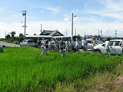 これは7月3日に行われた第1回目の巡回と同様、会員の圃場(田んぼ)を回り、稲の発育状態を調査するもので、今回も車を連ね、研究会の鈴木良紀会長をはじめ会員、JA関係者、そして、花の舞から事務局の斎藤、土田製造部長、青木製造課長、蔵人が参加し、湖西市から浜松市、磐田市まで各地区の代表19圃場を巡回しました。