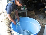 その後取り出して5分間ほど冷やし、つぎに、微生物が菌を殺してくれる微生物農薬を入れたポリタンクの中に丸1日浸けて消毒します。