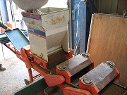 それから、もみまきの3〜5日前に種もみの消毒をします。まず「温湯消毒」。温湯殺菌機という器具を使い、種もみを60度Cのお湯の中に10分間入れ殺菌するものです。