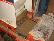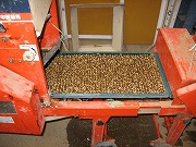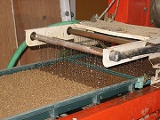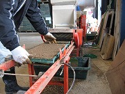 もみまきはベルトコンベアによる流れ作業で行われます。まず、苗箱をベルト上に乗せて送り、土を盛る。その上に水をまく。そして、その上に種もみをまきます。