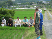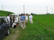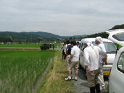 昼食時には磐田地区の会員、JA関係者、そして、花の舞の土田杜氏も合流して人数が増えました。午後の部最初の巡回は研究会相談役の乗松精二さんの圃場。一行が到着しても乗松さんの姿はなく、どうしたのかと心配していると、砂煙をあげながらトラックでかけつけました。聞けば、昼まで田植えをしていたとのこと。ちょうどこの日ですべての田植えが終了したそうで、顔はすっかり日焼けしていました。乗松相談役と顔を合わせるのは3月に行われた研究会の総会以来という会員も多く、しばし、なごやかに歓談しました。この後一行は、磐田、森町、袋井地区を夕方まで精力的に巡回しました。鈴木会長は「分けつの状況をよく見て、中干しに入ってほしい。今のところ生育は順調です」と総括しました。