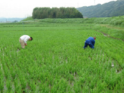 今年は梅雨のさなかの6月下旬から高温が続いています。稲の生育のためにこれからどんなことに気をくばればいいのか聞いてみると、「水を浅くした方がいいです。水をためておくと水温が上がりますからね。きょうの巡回で計ったら33℃くらいありました。そういうときは水を抜いて熱を発散させた方がいい。中干し前に間断灌水(水を入れたり抜いたりする)をやった方がいい田んぼがいくつかありました」。