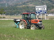 静岡山田錦研究会の鈴木会長は4月2日山田錦の圃場(田んぼ)に土壌改良剤を入れました。これは毎年この時期に行っているもので、土壌改良剤を入れた容器をトラクターの後ろにセットし、圃場の外側からゆっくり進みながらまんべんなくまいて、だんだん内側に向かっていきます。広い圃場ですがトラクターを使えば5分ほどで作業は終了します。この後は土壌改良剤が流れないよう土の中に入れるために、もう一度圃場を軽く打ち(起こす)ます。