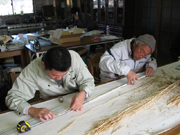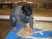 もう1つのグループは稈基重(かんきじゅう)の測定を行いました。これは、平成18年度から行われているもので、稲一株のいちばん下の地ぎわを切り落とし、そこから上10cm分を切り取ります。そして、1本1本の皮をむき芯だけ残し、その重さを計り、10本当たりの重量に換算した数値を出します。
