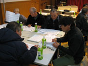 この後は、地区ごとに分かれ、副会長がリーダーとなってグループ別勉強会を行いました。この間、花の舞の青木副杜氏と斎藤主任が米に関する質問を乗松相談役にしてレクチャーを受けており、勉強はあちこちで行われていました。