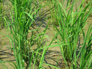 午前中の巡回が終わった時点で鈴木会長に稲の様子について話しを聞きました。その第一声は、「葉の色が例年に比べると濃いですね」。その理由を聞くと、「天気が良すぎたので肥料を先に吸っているからです」と言います。詳しく解説してもらったところによると、田植え時にいわゆる一発肥料をやった会員が多いのですが、その肥料は温度が一定の高さに達すると数日後に溶け始めるようになっているのだそうで、6月は気温が高い日が多かったため、早めに動き、肥料が溶け始めているために稲の葉の色が濃いということなのです。