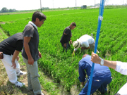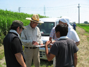 その合流地点の一つ、浜松市都田地区にある鈴木会長の山田錦の圃場では午前10時過ぎから、炎天下約10名の会員やJA職員が本隊を待ちうけていました。10時半頃、湖西方面の巡回を終えた本隊が車列を組んで到着。「ごくろうさま。暑いね」とあいさつをかわし、さっそく計測が行われました。