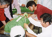 平成18年5月31日午後4時から、静岡山田錦研究会の「苗持ち寄り研修会」が花の舞酒造(株)で行われました。これは毎年この時期に行われている定例の活動で、会員全員が自分の育てた苗を一箱ずつ持ち寄って、その成長具合をチェッし、適切な田植え日を決めるというものです。 今年はゴールデンウィーク以降天候が不順で気温が低く、日照時間も少なかったため、苗の成長に影響が出ることが懸念されましたが、「下旬になってようやく夏のような日がしばらく続いたので、苗も一気に大きくなりました」と語る会員もいました。