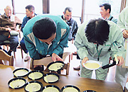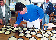 ![]() 全員の米が並べられて審査が行われる![]() ![]() 審査する土田杜氏![]() ![]() 審査するJAの農産物検査委員![]() |