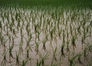 田植えの後、10日位すると苗は20cmくらいになります。苗から稲へ、これからグングン成長していきます。この後、田んぼでどんな作業をするのか鈴木会長に聞くと、「除草剤をまくときだけその効果が出るように、水を深く張って動かないようにしておきますが、それ以外は水を浅く張っておきます。田んぼの土が少し見えるくらいの浅水管理です」。 |