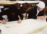 < 稲の1本1本を計測、計量。役員によって稲体の形態調査が行われる。> | |