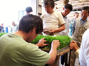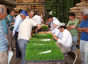 まず、静岡山田錦研究会の鈴木良紀会長が「今年も山田錦の田植えの時期が迫ってきました。今日は苗のチェックをして予定日などをアドバイスするので、それをもとに各自田植え日を決めてください」とあいさつ。人数が増え、苗の数が増えたので、作業はテキパキと進められました。 苗のチェックの方法は、テーブルに順番に一ずつ苗箱を乗せ、その苗を育てた会員にここまでの状況を聞きながら、研究会の役員が①床土資材名・②播種日・③播種量の確認、④草丈・⑤2葉までの長さの計測、⑥葉齢・⑦根張りの確認を行います。そして、それらを勘案して適切な田植え日を決めます。会員は毎年、1年間の山田錦栽培の管理記録をつけています。今年も1月から記入しているため、この日、たとえ本人がいなくてもこの記録さえあれば適切な田植え日を決定することができます。 管理をしっかりやってコストを下げ、1等、反収7俵が目標。 また、今後の作業についても触れ、資材が高騰しているので、農薬など、必要以上の経費をかけないよう提案。そのためには、よく観察しながら適期に消毒すること。田植えも、分けつが早くなる浅植えを実施するよう指示しました。 さらに、乗松精二相談役がまとめた平成20年の1月から5月までの気温の経緯の資料を配布し、今年は去年に比べ毎月気温が低いことを指摘。6月も低いことが予想されるが、その場合の肥料の量についてどうすべきかの説明を行いました。 そして最後は、「管理をしっかりやることでコストを下げましょう。そして、等級1等、反収7俵を取れるよう努力しましょう」。と締めくくりました。 この後は近くの飲食店に場所を移し、懇親会となりました。まず、花の舞の土田製造部長が「お互いに生産性を上げ、共存共栄でやっていきましょう」とあいさつし、乾杯の音頭をとり、花の舞の新商品「純米花ラベル」で乾杯しました。この商品には山田錦が使われていますが、もちろん研究会のメンバーが生産したものです。この後、しばらく歓談が続き、今回の研修会は終了しました。 研究会の次回の活動としては、7月上旬に今年最初の圃場(田んぼ)の巡回が行われる予定です。 次回も「静岡山田錦研究会レポート」をご覧ください |